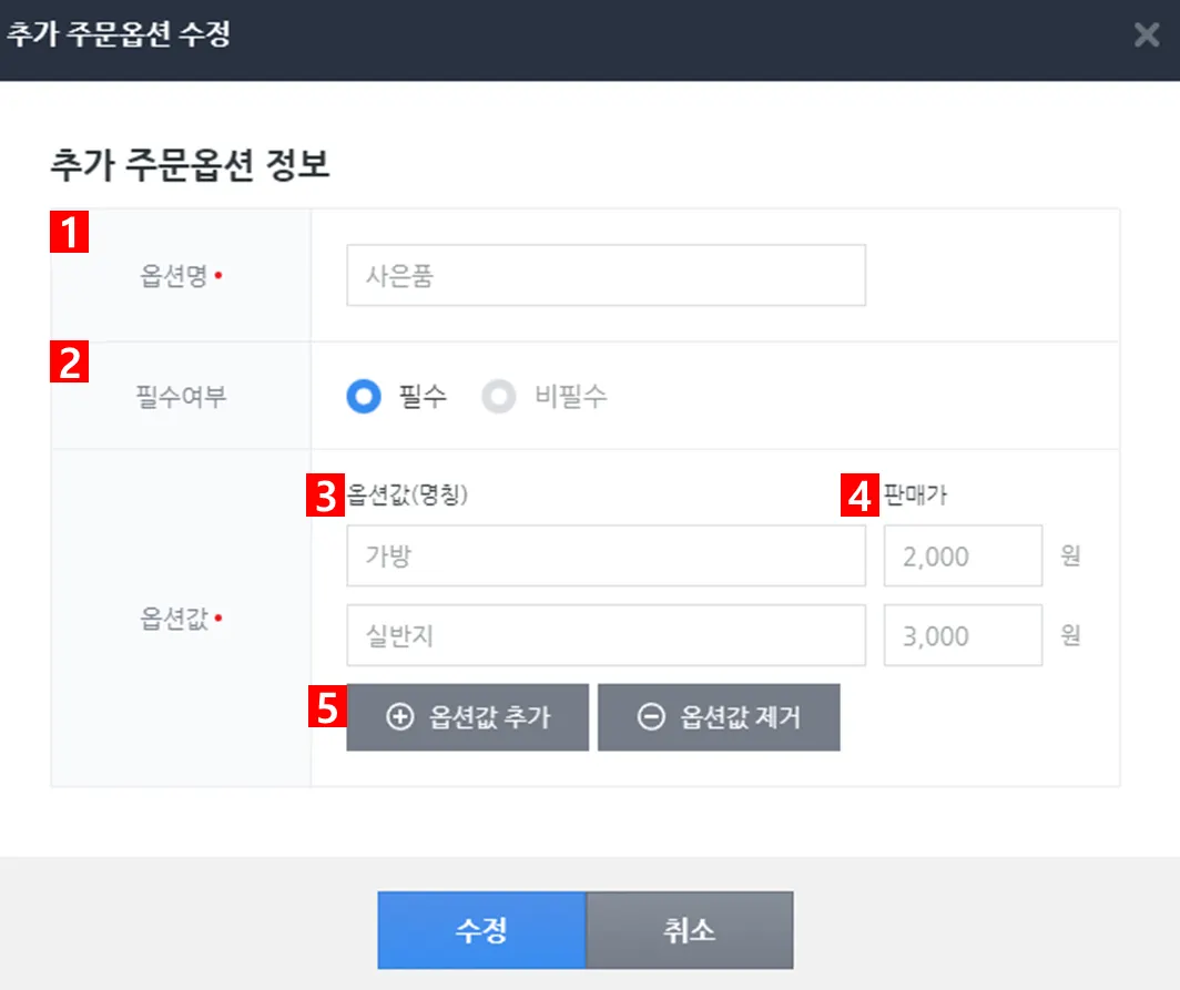 기존에 등록된 추가 주문옵션의 수정은 [쇼핑몰 설정 > 추가 주문옵션]에서만 가능합니다.