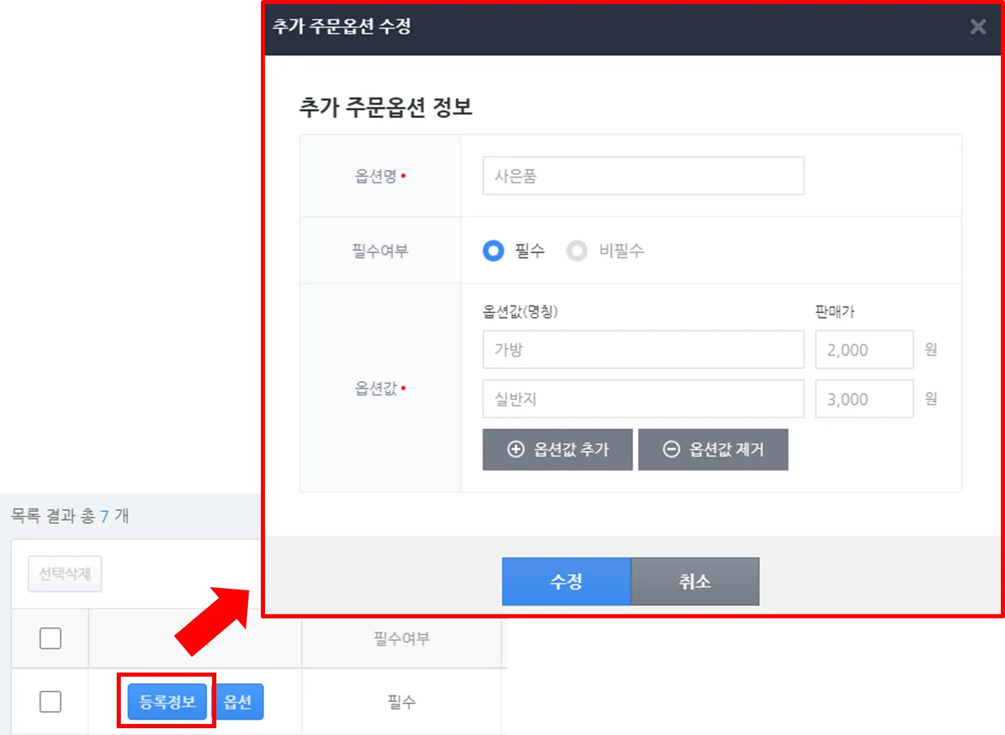 4) 등록된 추가 옵션의 '등록정보' 버튼을 클릭하면 '추가 주문옵션 정보'를 수정할 수 있습니다.