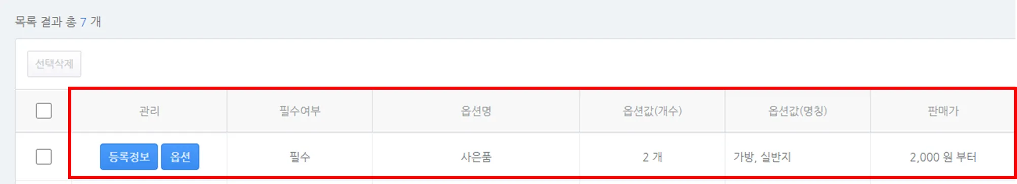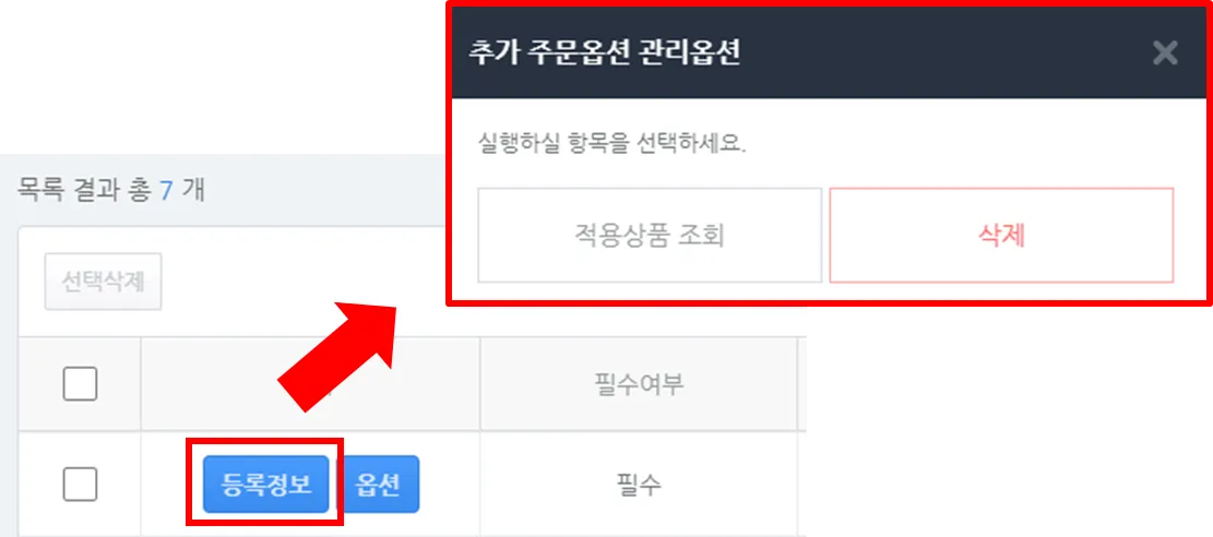 5)'옵션' 버튼을 클릭하면 해당 옵션이 적용된 상품을 '조회'하거나 '삭제'할 수 있습니다.