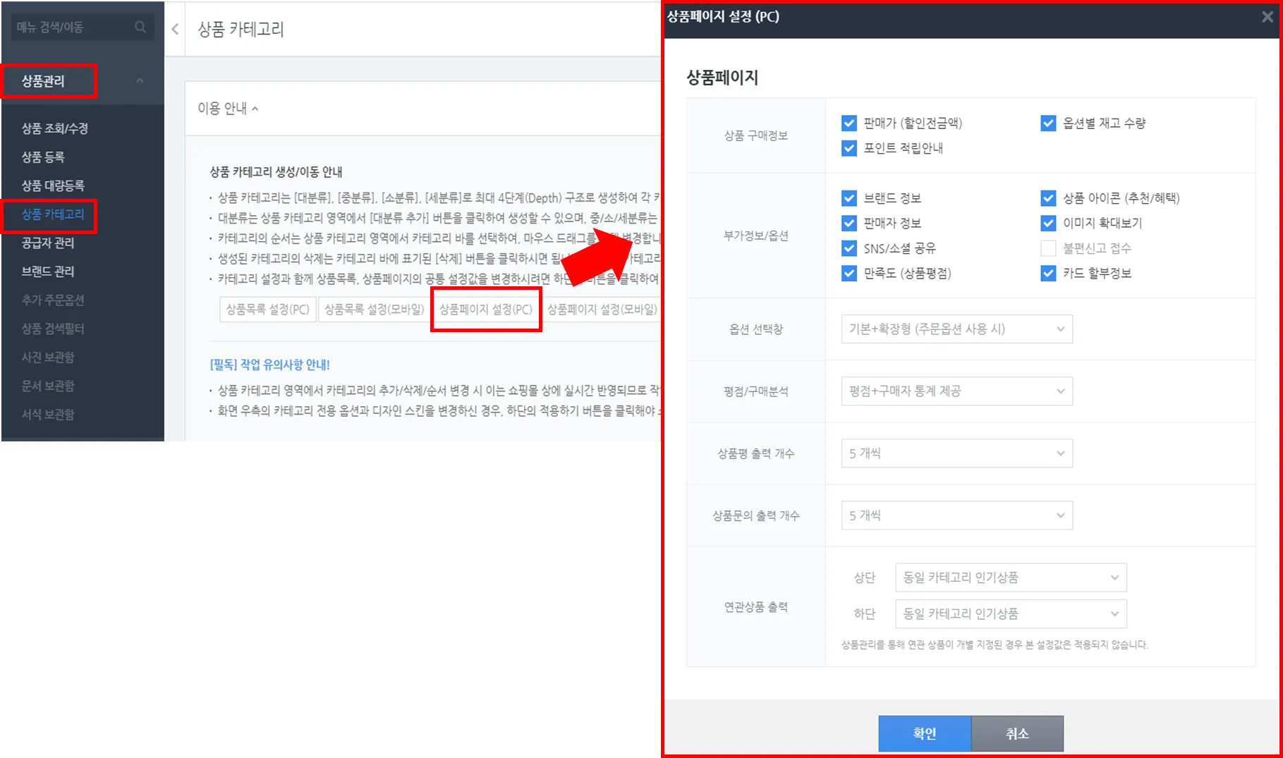 상품관리 > 상품 카테고리 > ‘상품페이지 설정’ 팝업 화면
