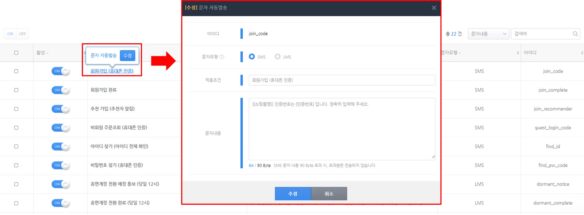 2) 문자 내용은 적용조건 명칭을 클릭하여 수정이 가능합니다.