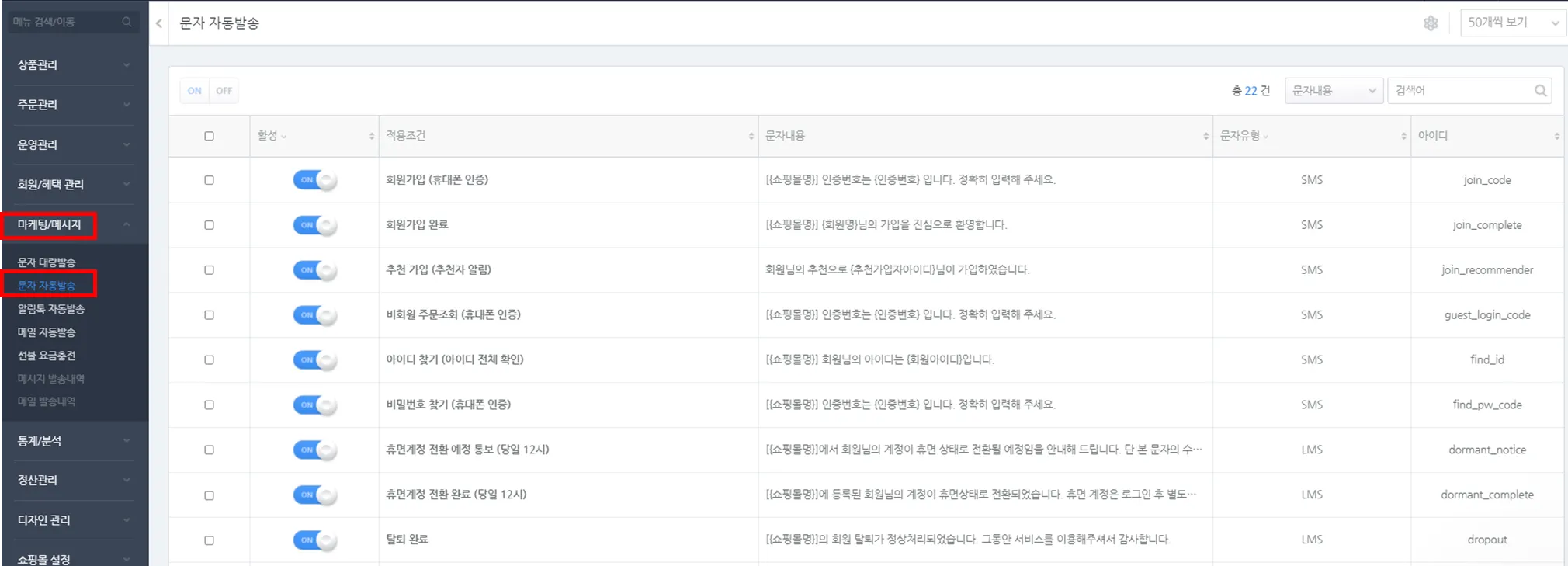 경로 : 마케팅/메세지 > 문자 자동발송