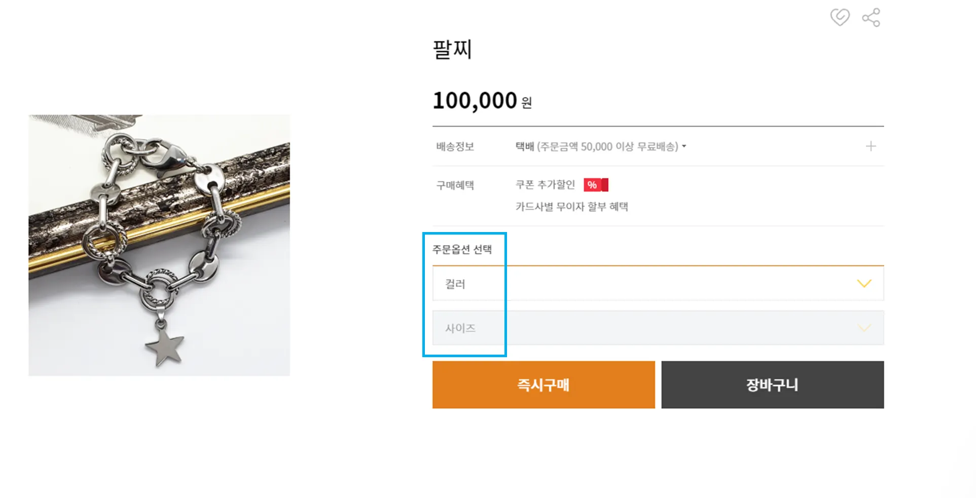 고객은 주문옵션을 차례대로 선택하고 구매가 가능합니다. (옵션1(컬러) >옵션2(사이즈) > 구매)