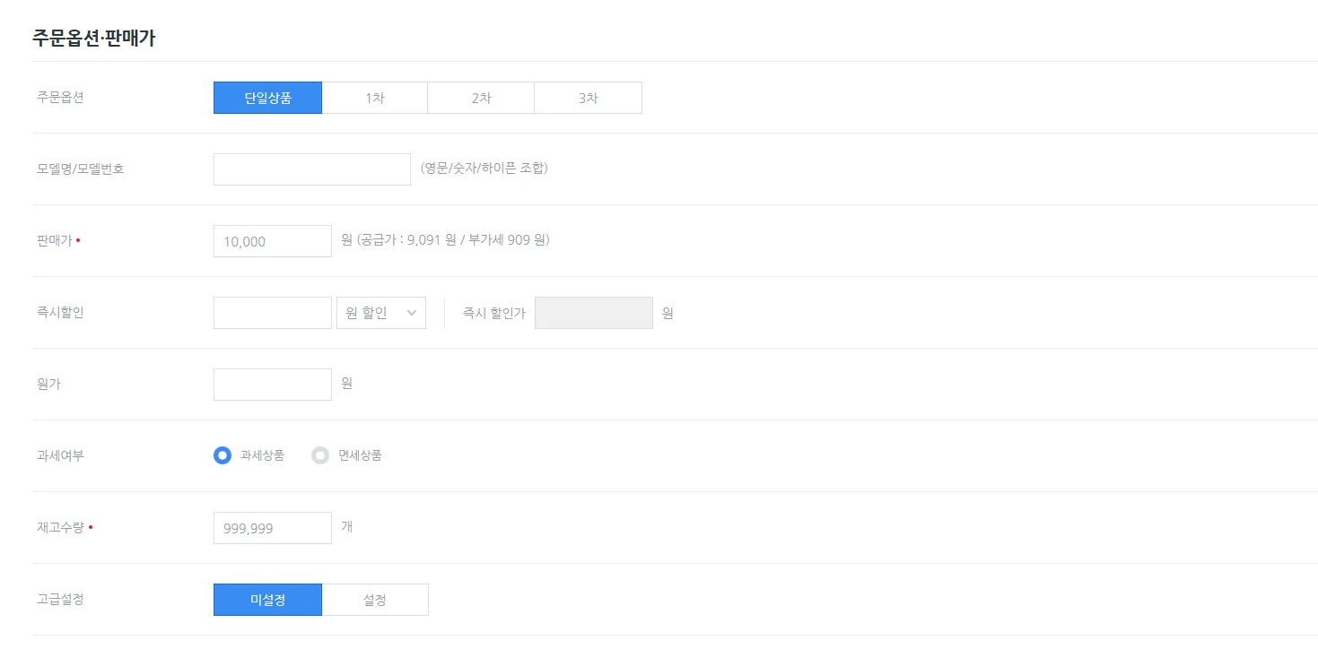 옵션없이 단독 상품을 등록하는 경우입니다.