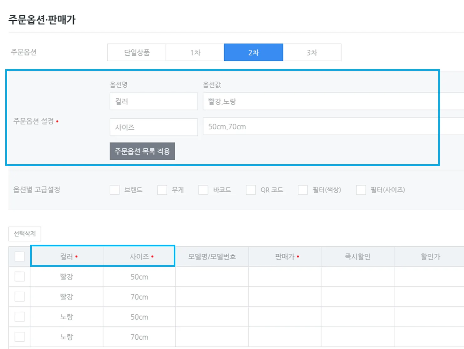 주문옵션 2차 선택 시 두개의 옵션명, 옵션값을 설정할 수 있습니다.