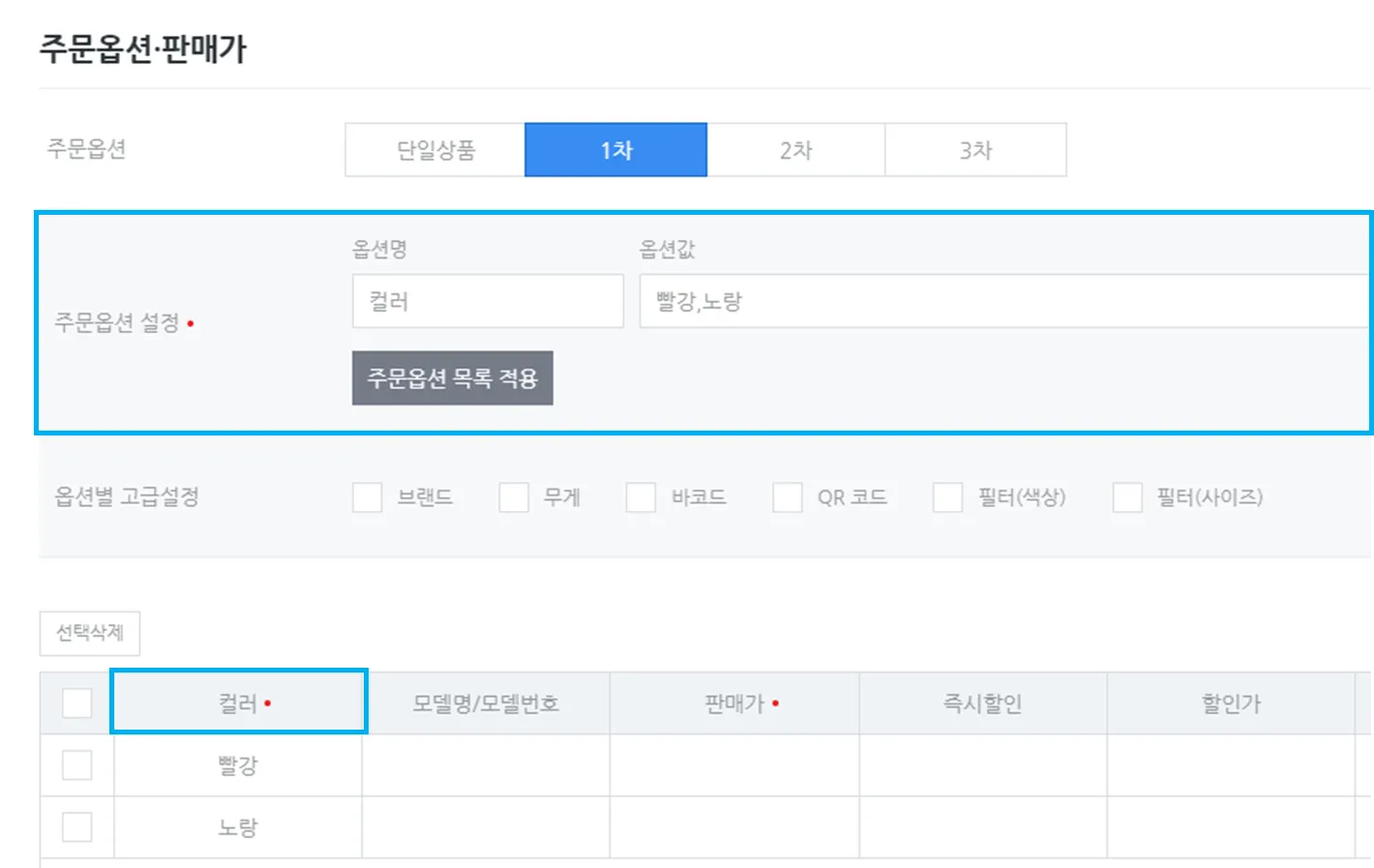 주문옵션 1차 선택 시 하나의 옵션명, 옵션값을 설정할 수 있습니다.