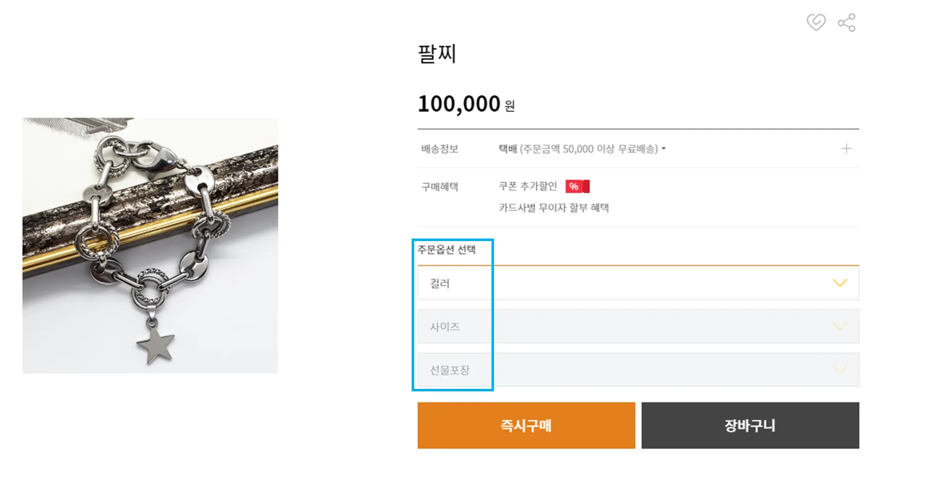 고객은 주문옵션을 차례대로 선택하고 구매가 가능합니다. (옵션1(컬러) >옵션2(사이즈) >옵션3(선물포장) > 구매)
