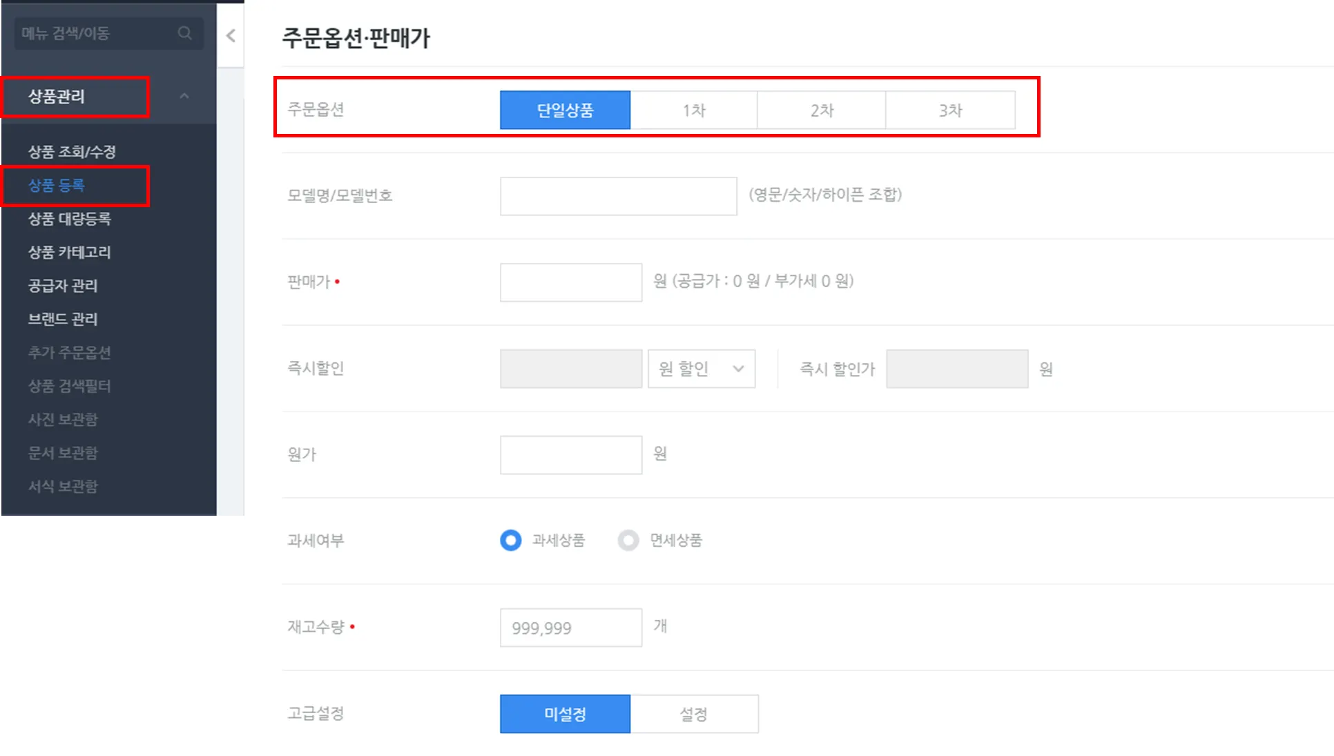 단일상품은 상품등록 시 기본값으로 설정되어 있습니다.