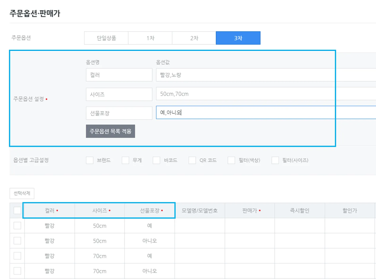 주문옵션 3차 선택 시 세개의 옵션명, 옵션값을 설정할 수 있습니다.