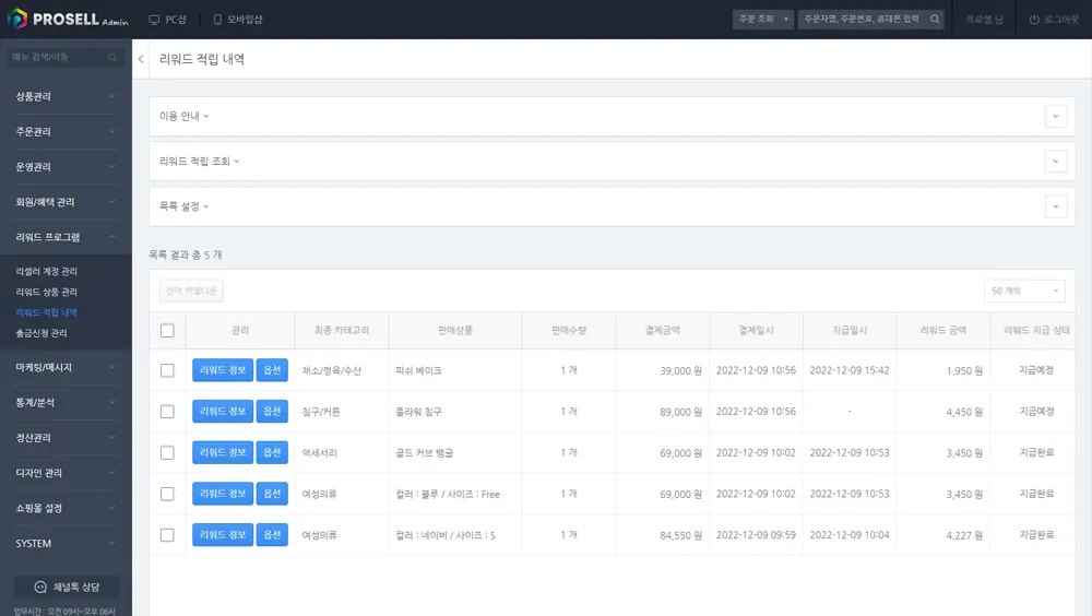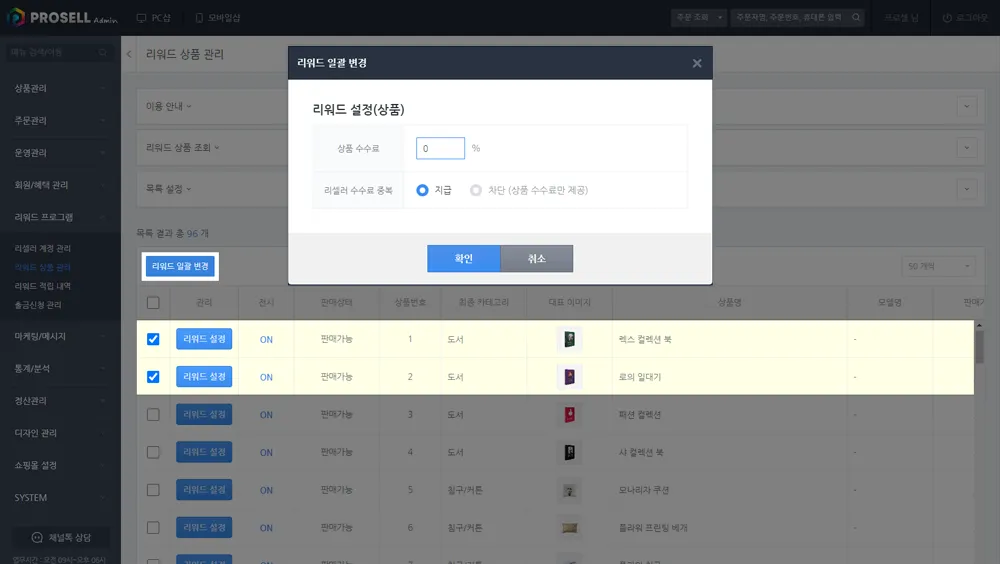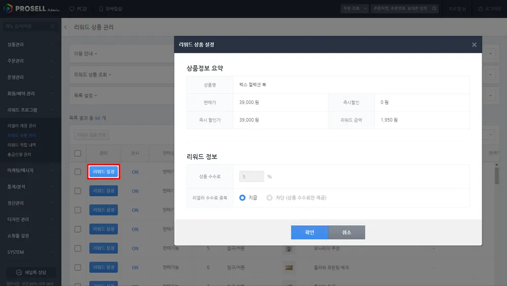 (2) 리워드 프로그램 > 리워드 상품 관리에서 수수료를 개별 적용할 상품의 리워드 설정을 클릭 합니다.