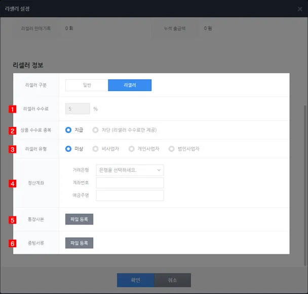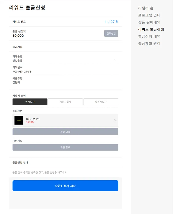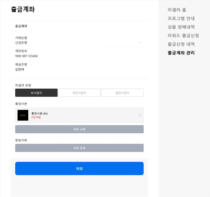 리셀러가 리워드를 정산 받는 통장 정보와 구비 서류를 등록하거나, 수정할 수 있습니다.