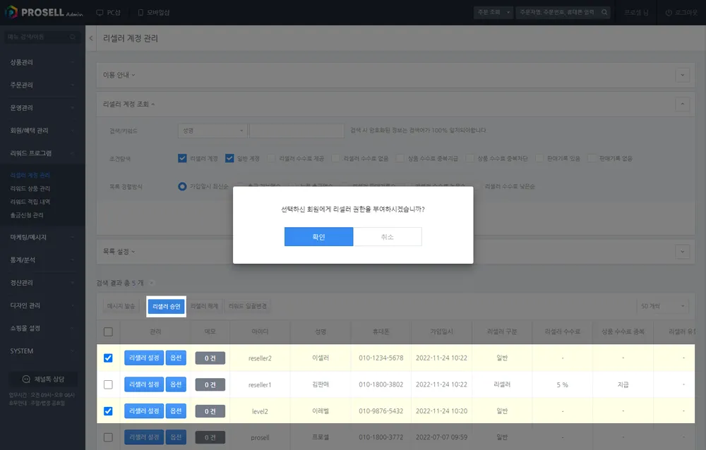 2명 이상의 회원에게 리셀러 권한을 부여하는 경우, 일괄적으로 리셀러 승인을 처리 합니다.