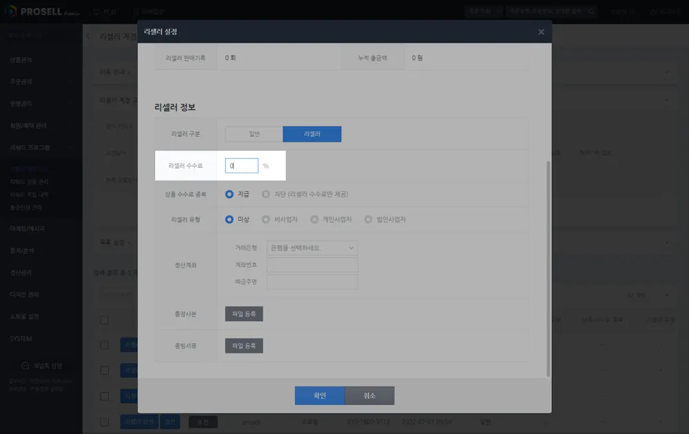 ※ 수수료 개별 적용의 경우, 리셀러 수수료는 0%로 개별 수정이 필요 합니다.