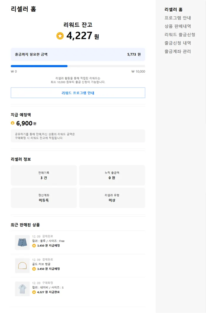 대시보드 형태로 리워드 잔고 및 지급 예정액 등 리셀러 활동 내역을 확인할 수 있습니다.