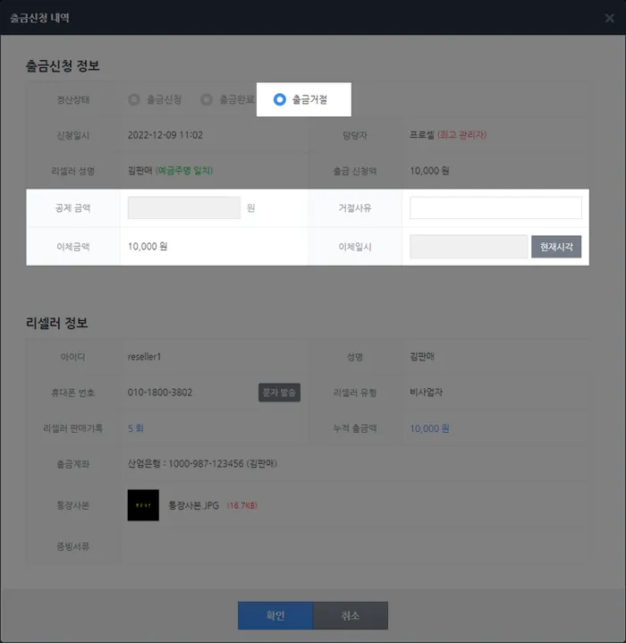 3) 출금을 거절하는 경우, 정산상태 변경 및 거절사유를 입력 합니다.