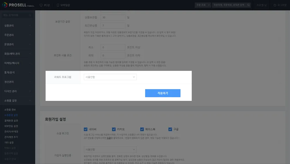 2) 쇼핑몰 운영 정책을 고려하여 리워드 프로그램의 설정 항목을 세팅 합니다.