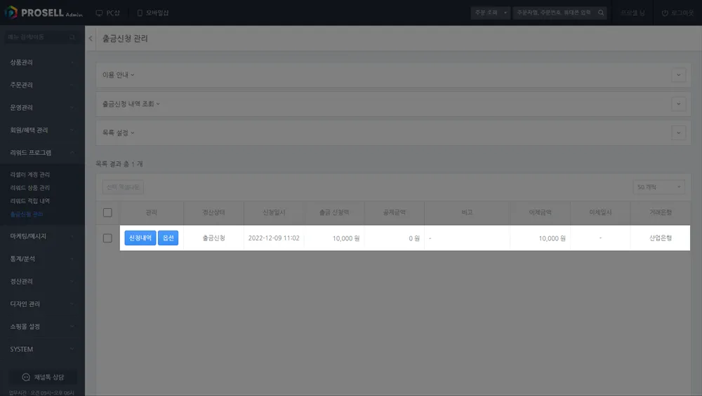 ※ 출금신청 관리는 리워드 지급 여부만 기록하며, 정산 등과 같은 업무는 별도로 처리해야 합니다.