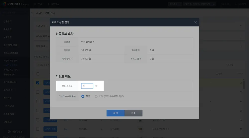 (2) 상품 수수료 입력 및 리셀러 수수료 중복 여부 설정 후 팝업창의 확인 버튼을 클릭 합니다.