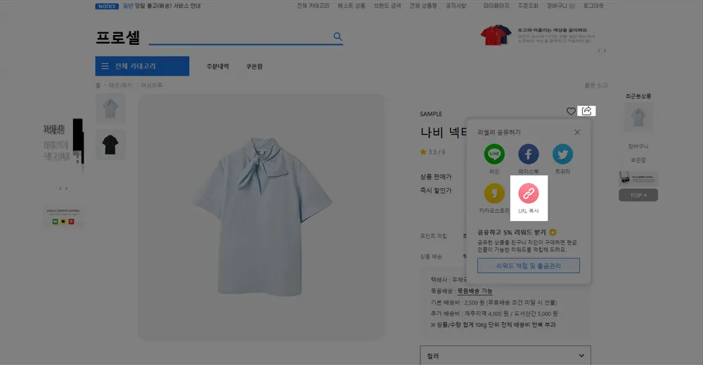 권한을 부여받은 리셀러는 쇼핑몰의 상품페이지 접속 후 공유하기 버튼을 클릭하여 리워드 링크를 전달할 수 있습니다. 기존 상품페이지 주소에 리셀러 고유번호가 붙은 URL 형태로 해당 링크를 통해 고객들이 쇼핑몰에 유입하여 주문/결제를 하면 됩니다.
