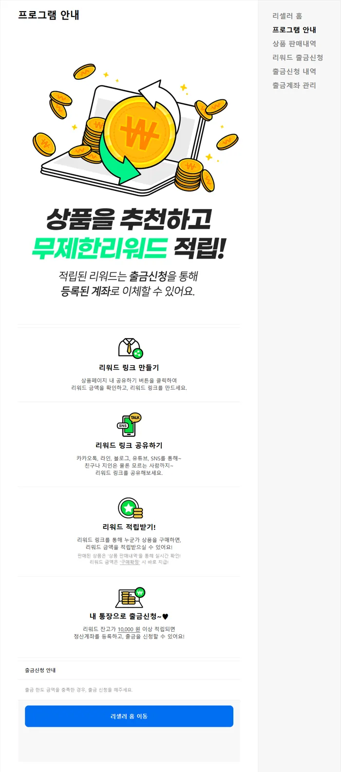 리셀러는 공유하기 버튼을 통해 리셀러 홈으로 접속이 가능하며, 적립된 리워드 확인 및 출금신청 등이 가능 합니다.