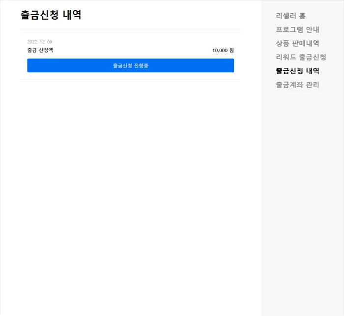 최소 출금 한도 이상의 리워드를 적립한 리셀러는 출금 신청이 가능하며, 접수된 신청은 해당 메뉴를 통해 처리할 수 있습니다.