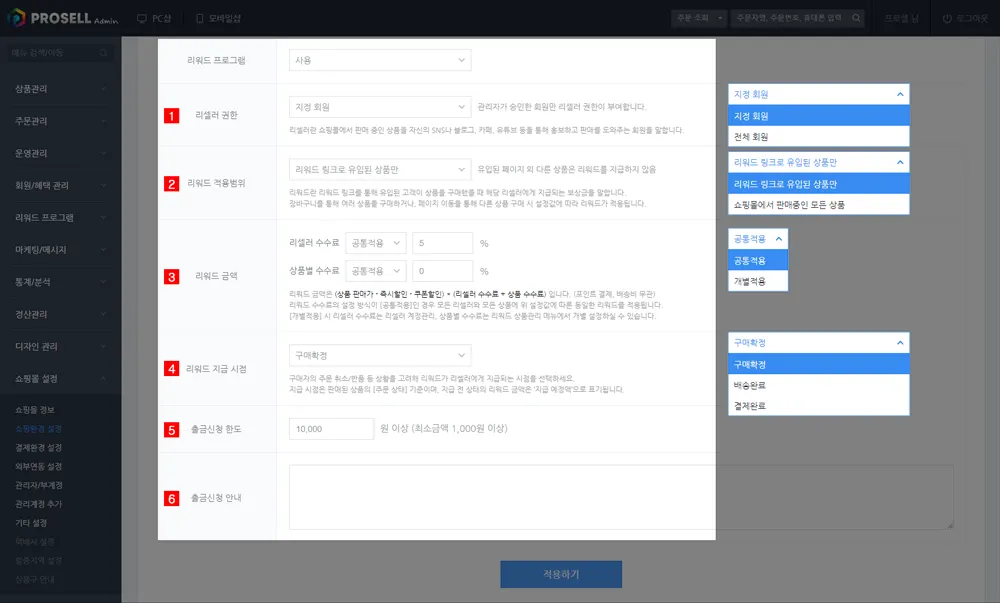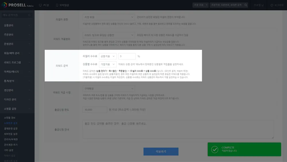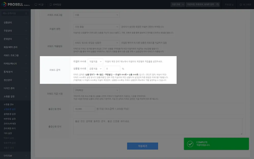 (1) 쇼핑몰 설정 > 쇼핑환경 설정 > 리워드 프로그램에서 리워드 금액의 리셀러 수수료를 개별 적용으로 선택 합니다.