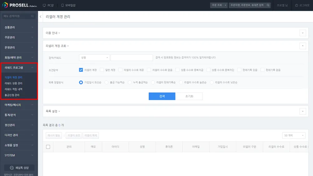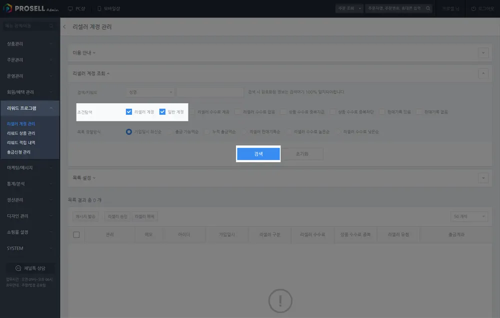 (1) 리셀러 계정 관리의 조건탐색을 통해 일반 계정을 포함한 쇼핑몰의 전체 회원을 검색 합니다.