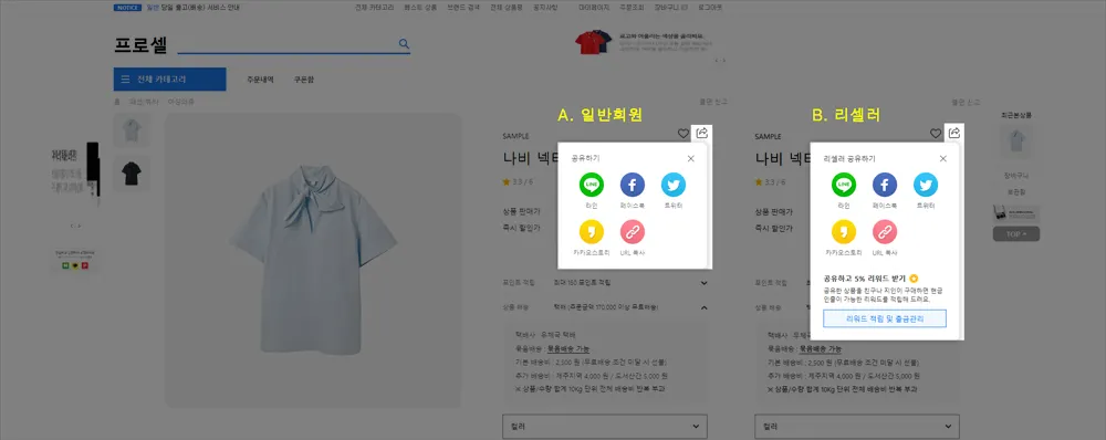 ※ 일반회원과 리셀러의 공유하기 메뉴 차이