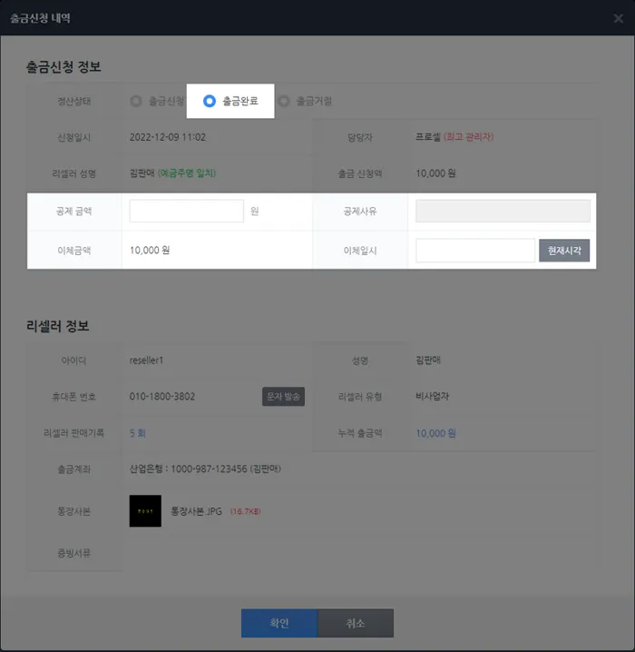 2) 출금을 진행하는 경우, 접수한 내역과 계좌 정보를 바탕으로 정산 진행 후 정산상태 변경 및 지급 정보를 입력 합니다.