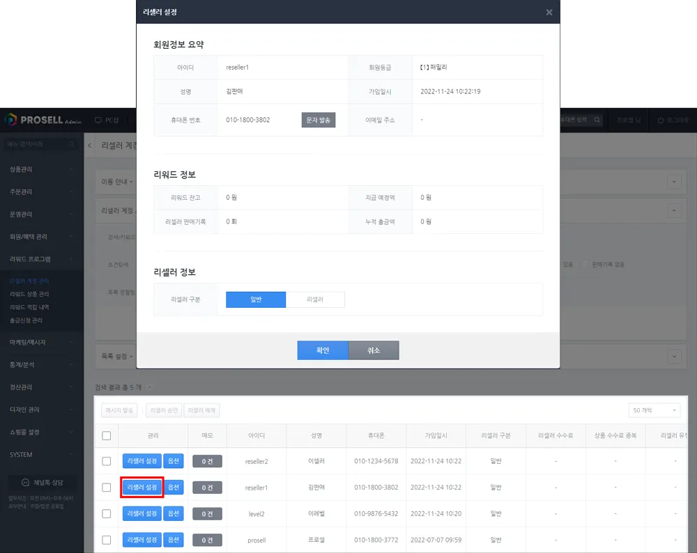 (2) 검색된 목록 중에서 리셀러 권한을 부여할 회원의 “리셀러 설정”을 클릭 합니다.