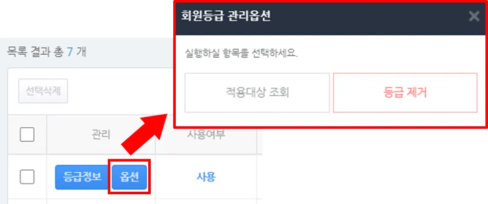 2) 등록된 회원 등급의 ‘옵션’을 클릭하면 적용대상 조회 및 등급제거 기능이 제공됩니다.