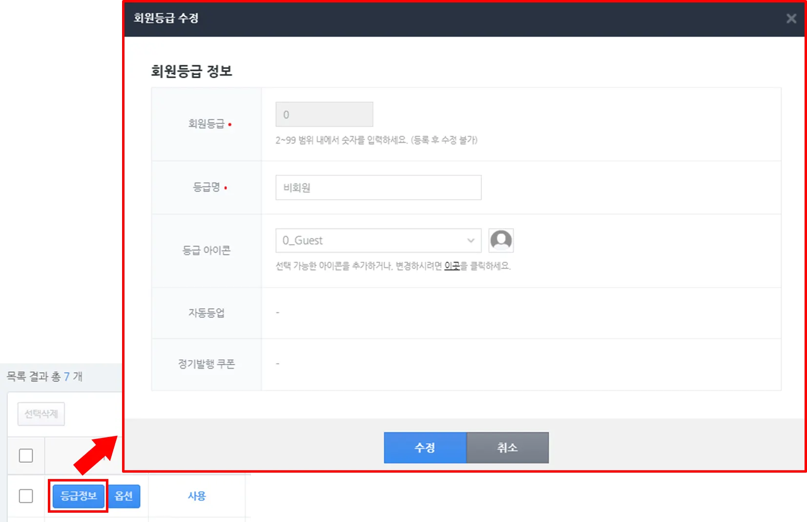 1) 등록된 회원 등급의 '등급정보' 를 클릭하면 '회원등급 정보'를 수정할 수 있습니다.