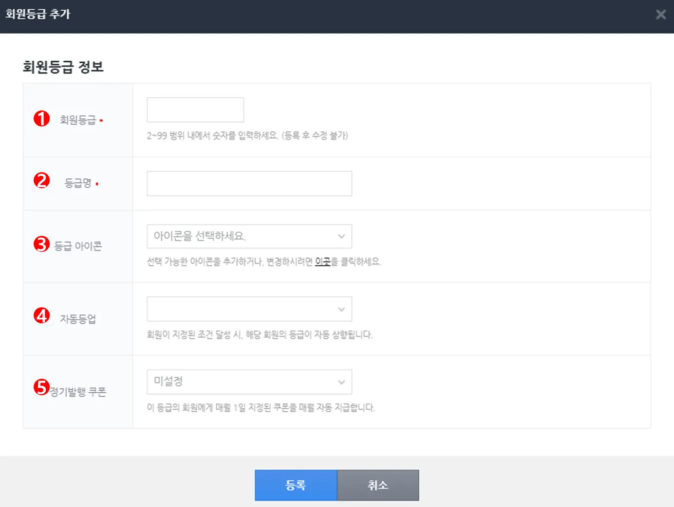 ① 회원등급 : 2~99 범위 내에서 숫자를 입력할 수 있으며, 숫자가 높을수록 높은 등급으로 분류됩니다.