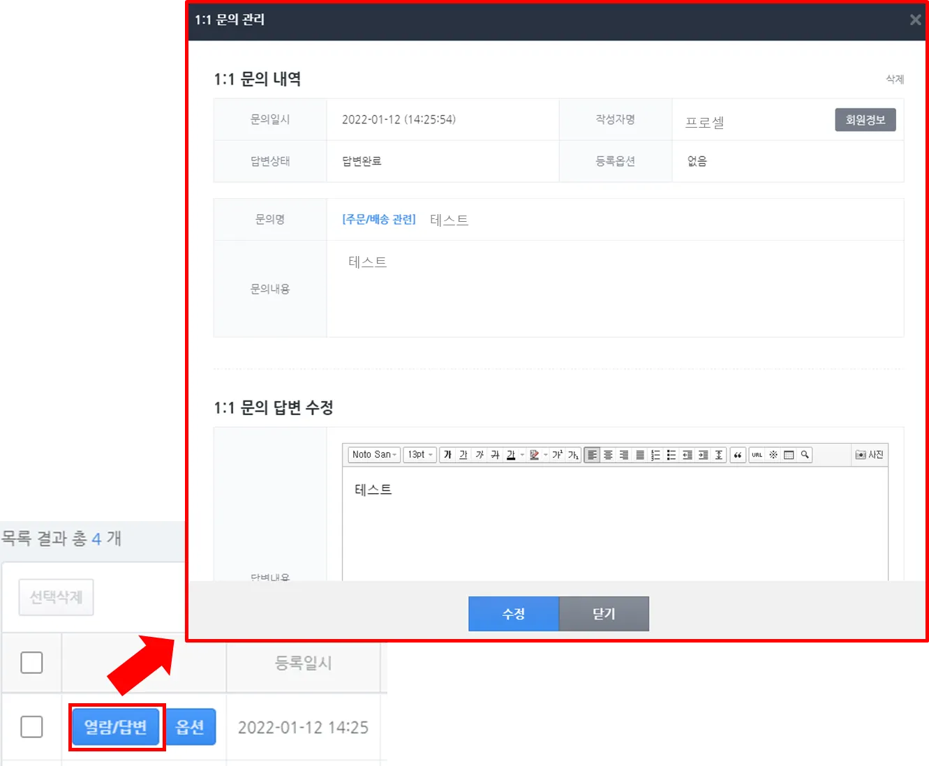 1) 1:1문의 글의 ‘열람/답변’ 버튼을 클릭하면 ‘1:1문의 관리’ 팝업을 확인할 수 있습니다.