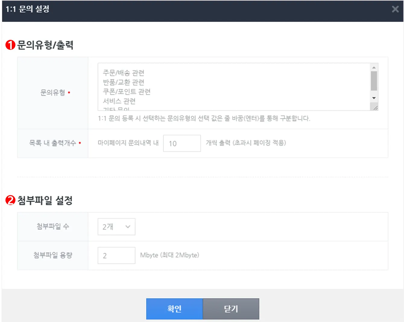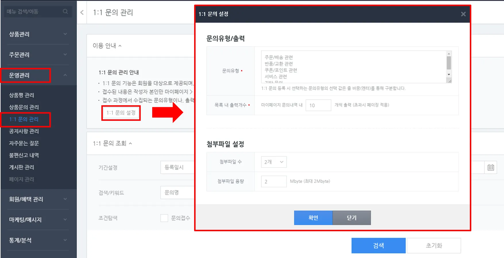 ※ 1:1문의 관련 기능 설정 및 관리 메뉴입니다.