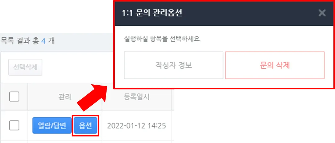 2) 1:1문의 글의 ‘옵션’ 버튼을 클릭하면 ‘1:1 관리옵션’ 기능을 사용할 수 있습니다