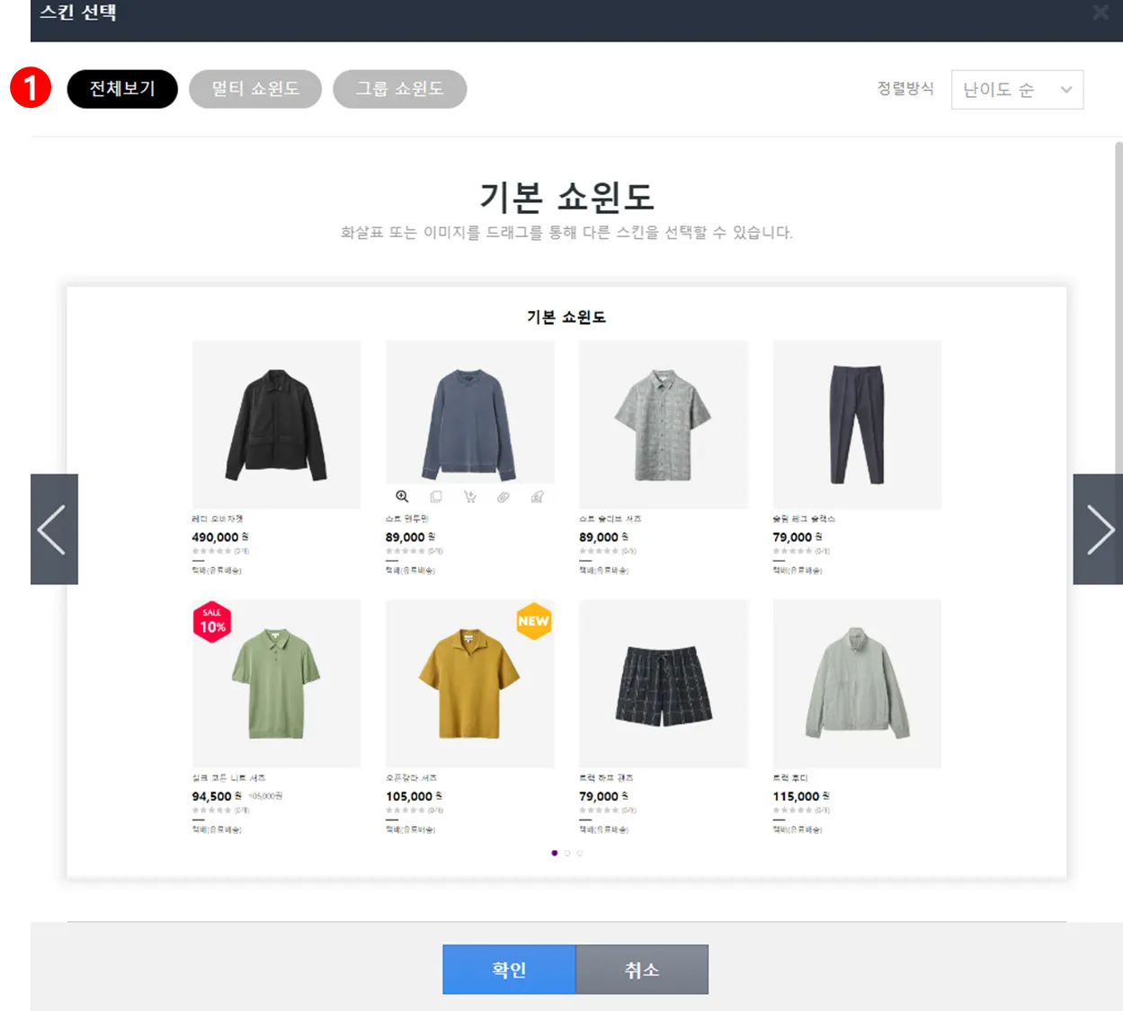 1) 상품 쇼윈도는 등록된 상품을 메인 화면에 노출하고자 할 때 사용하며, 여러 형태의 스킨 중 1가지를 선택하여 상품들을 노출할 수 있습니다.