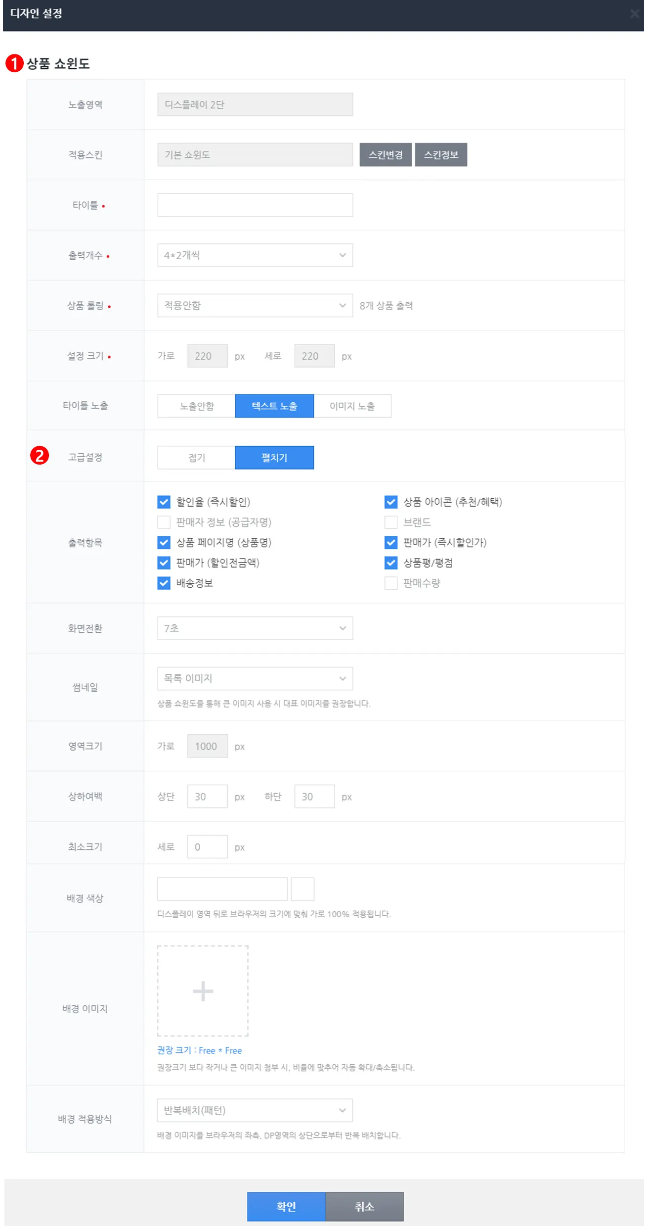 출력항목 : 상품쇼윈도에 출력을 원하는 항목을 선택하여 노출할 수 있습니다.