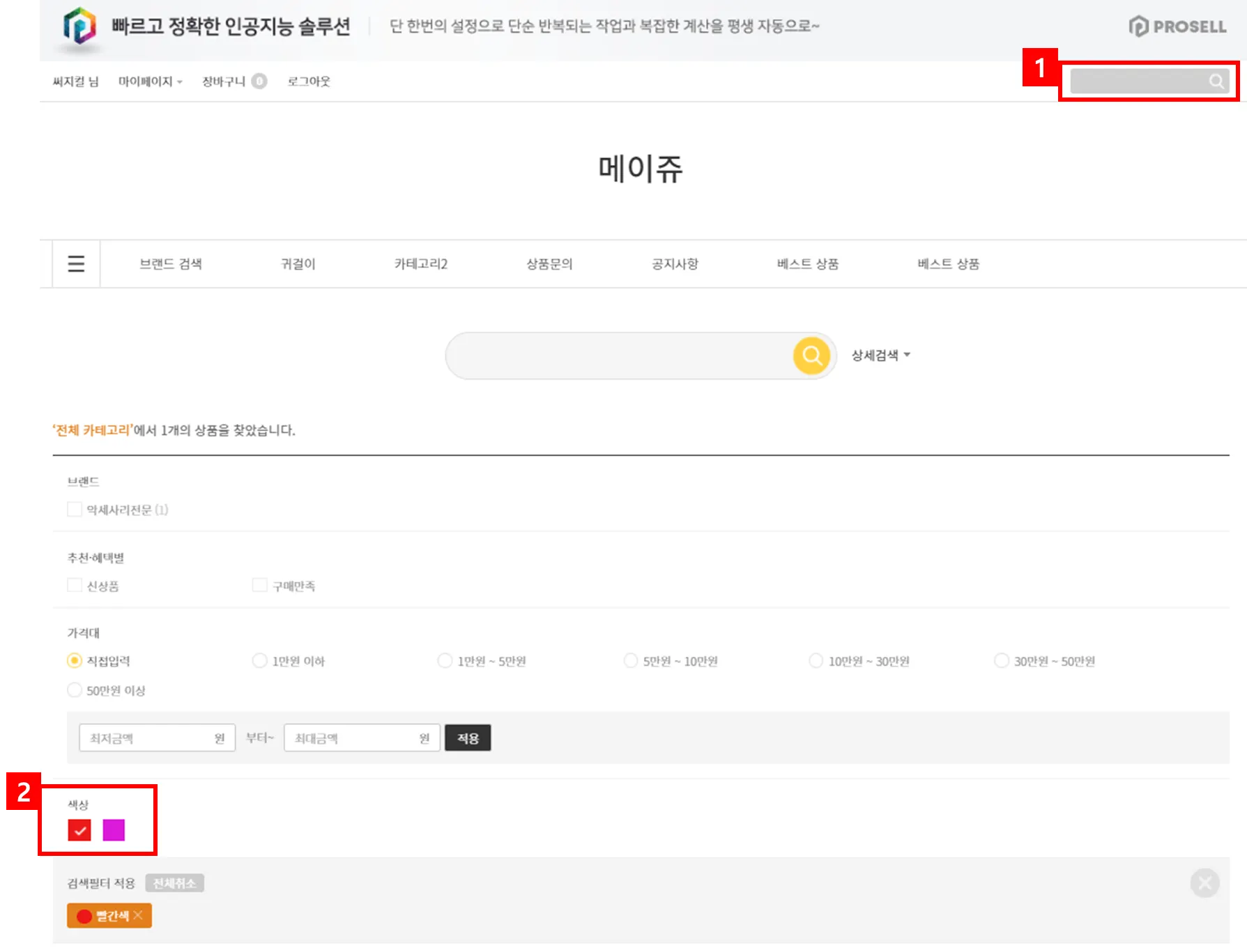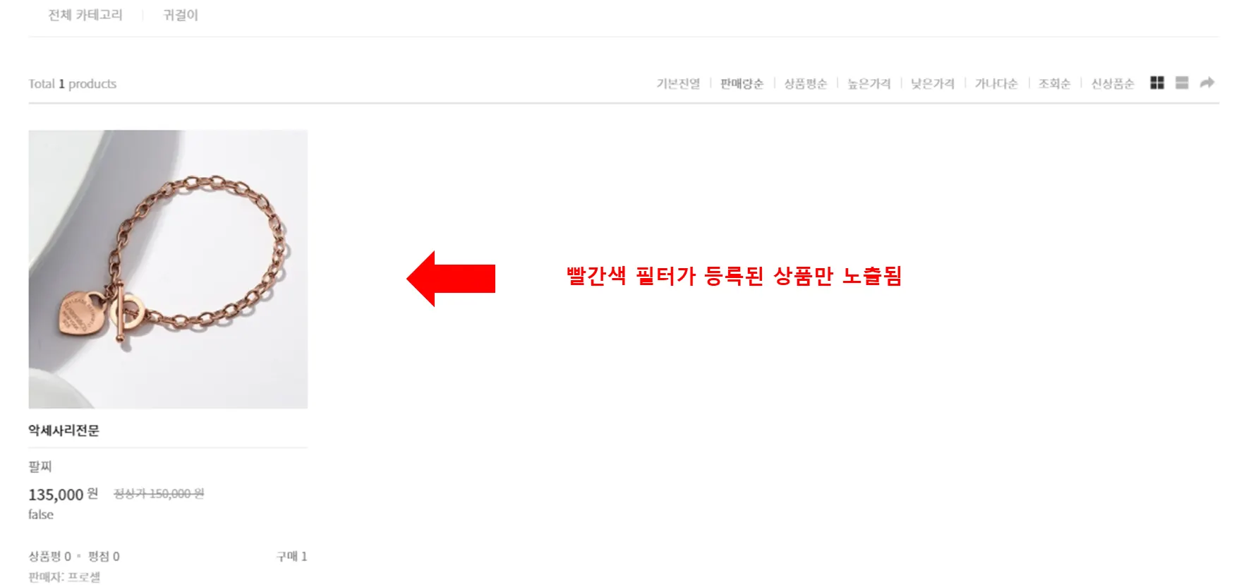 2) 필터가 등록되면 쇼핑몰 검색 메뉴에서 필터를 이용한 상품 검색이 가능합니다.