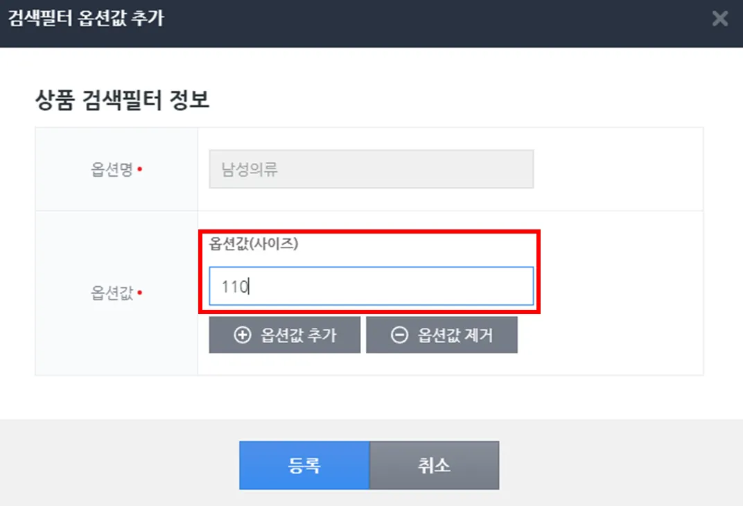 2) 남성의류에 추가를 원하는 필터 사이즈를 입력합니다.