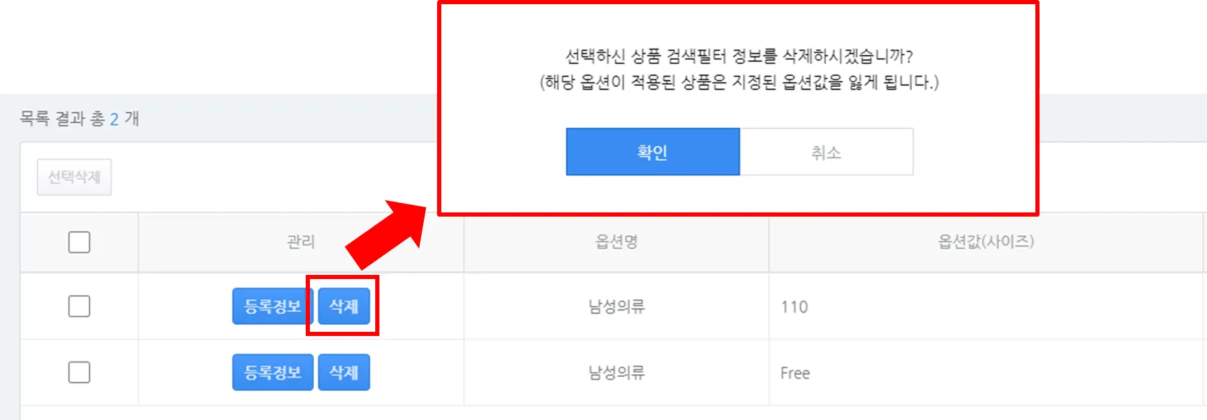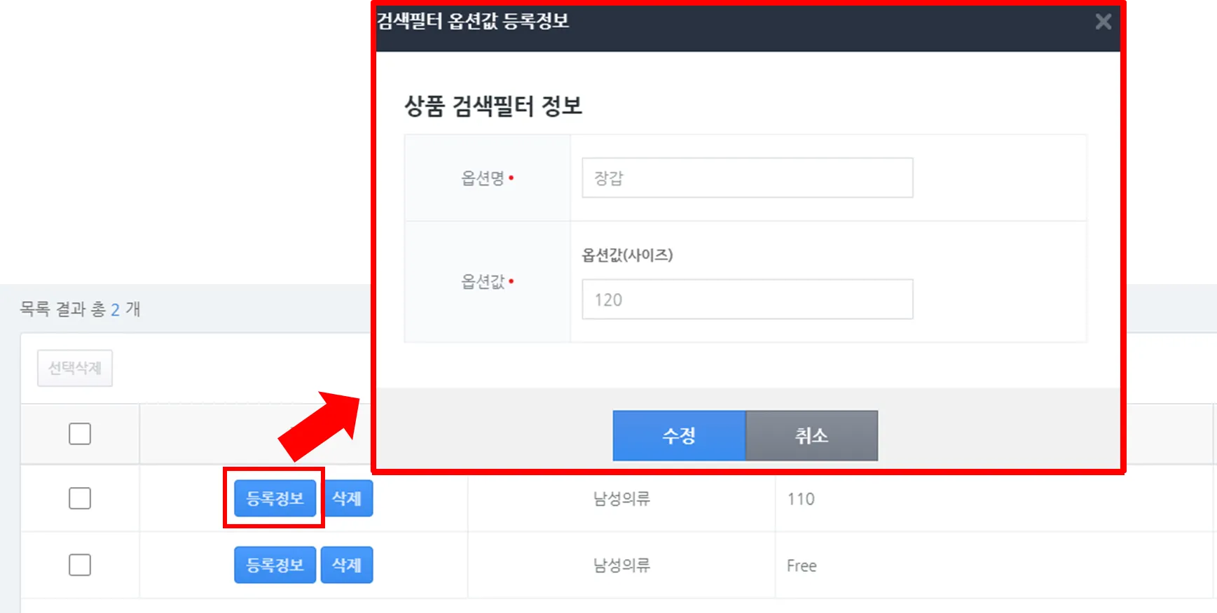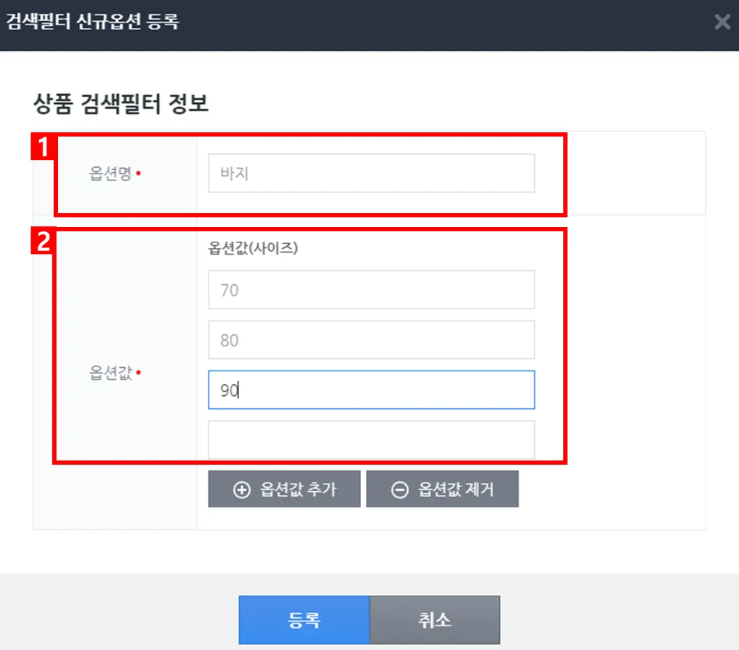 2) 상품 검색필터 정보에서 옵션명,옵션값을 설정할 수 있습니다.