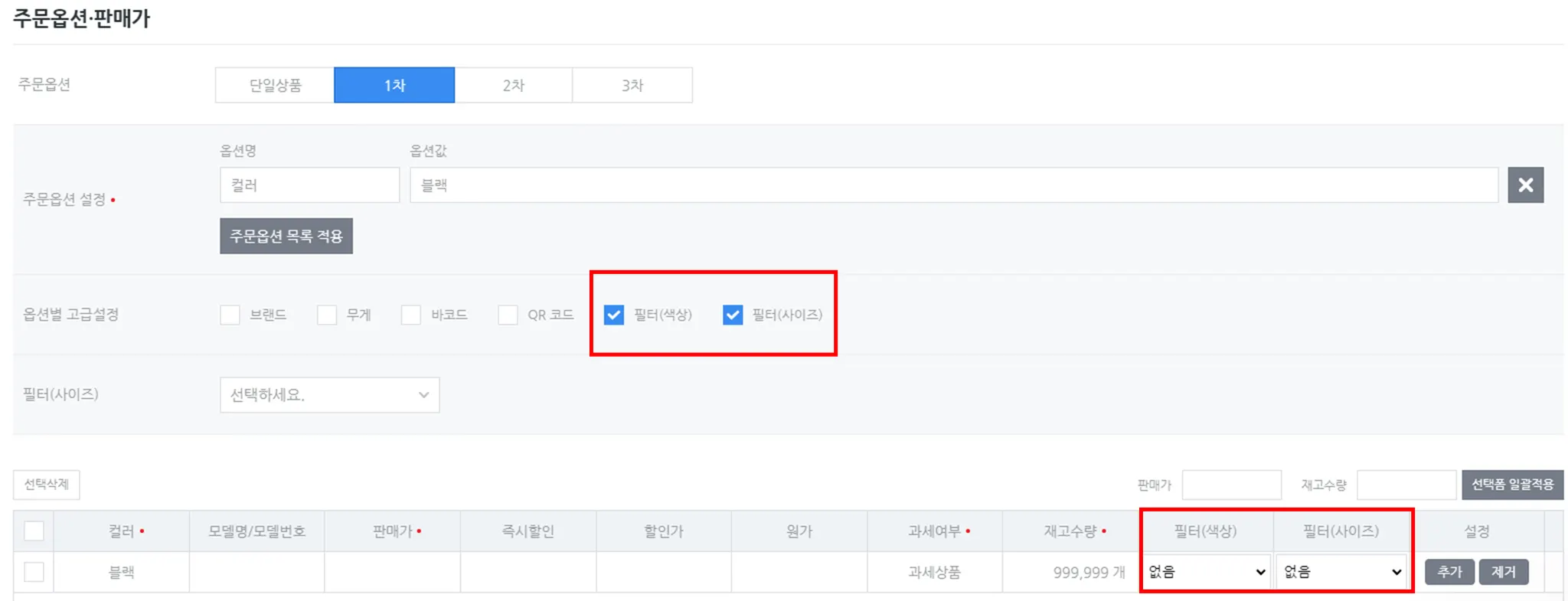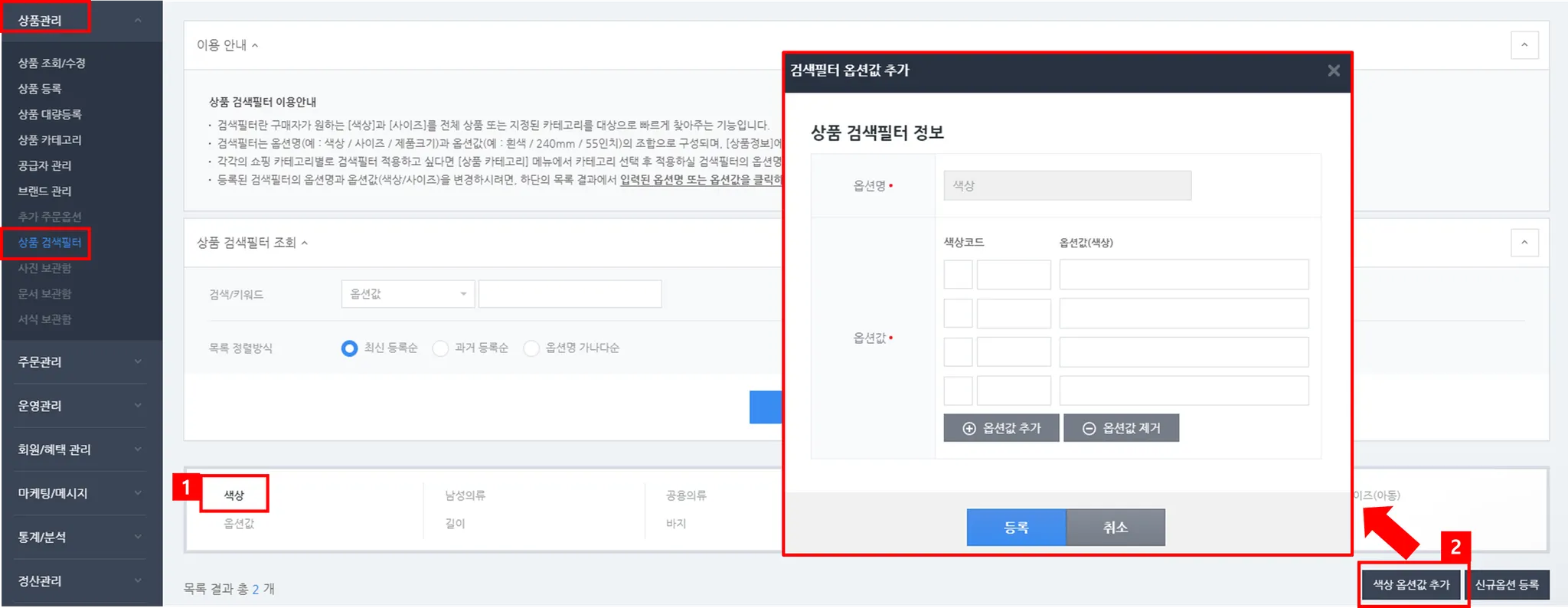 ※ 색상/사이즈 필터 옵션을 신규로 등록하는 메뉴입니다.