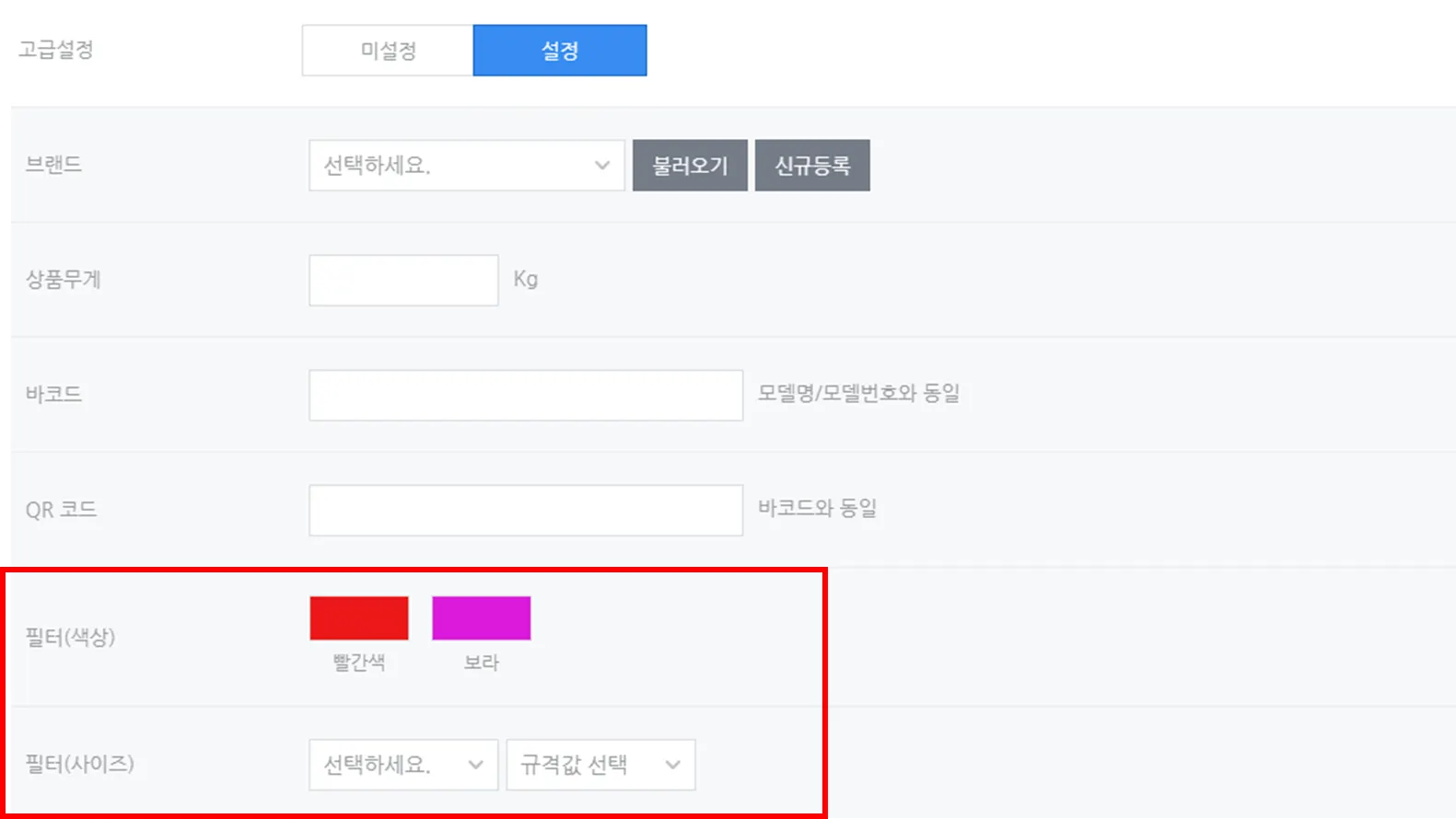 1) 상품 등록/수정 화면에서 ‘고급설정’ 기능으로 상품 필터를 등록할 수 있습니다.