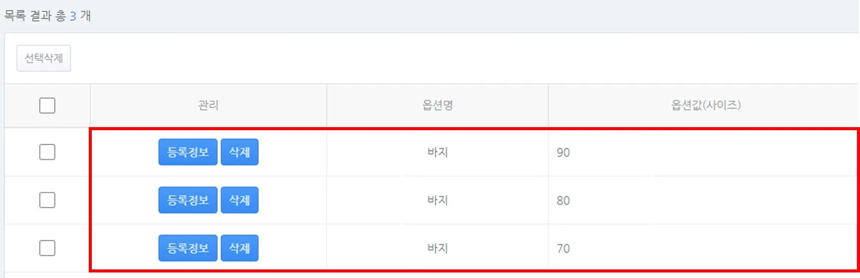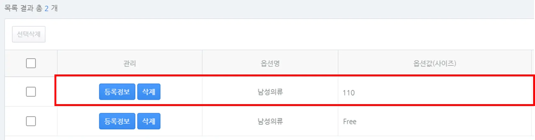 ② 옵션값(사이즈)에 사이즈를 입력 하고 '등록' 버튼을 클릭합니다.