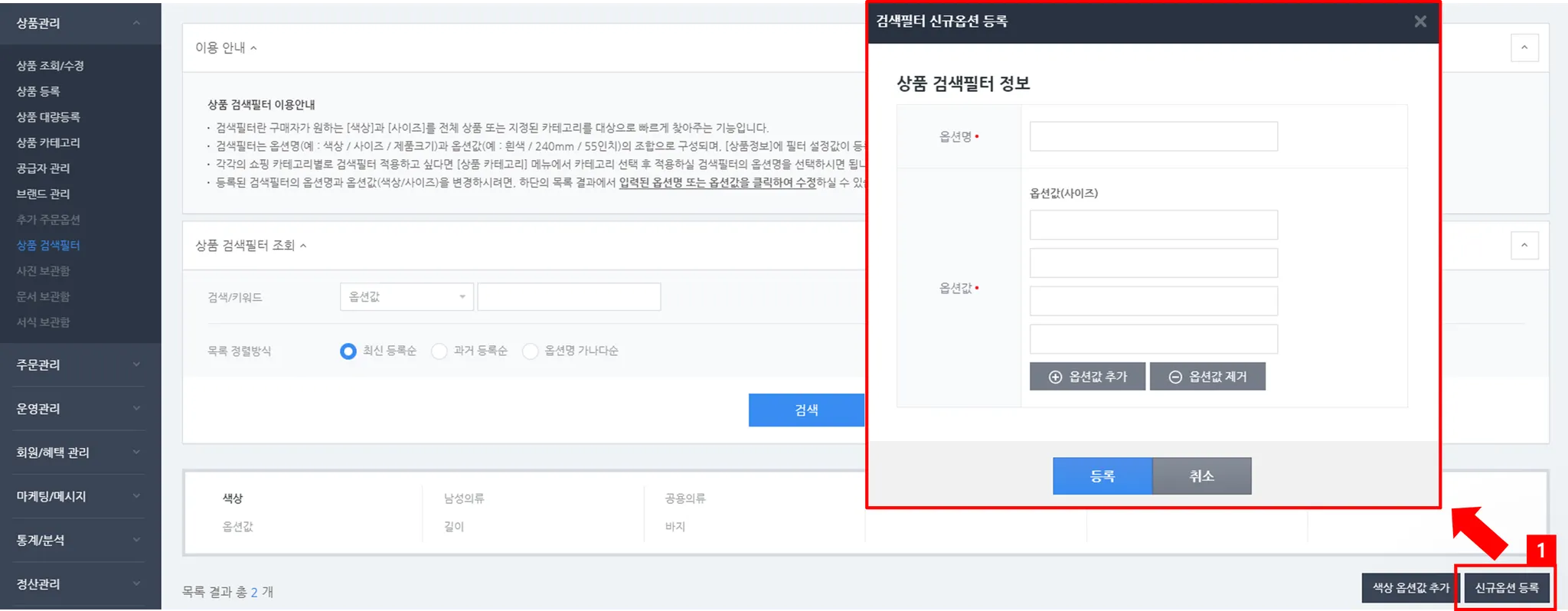 ① '신규옵션 등록' 버튼을 클릭하고 ‘상품 검색필터 정보’를 입력합니다.