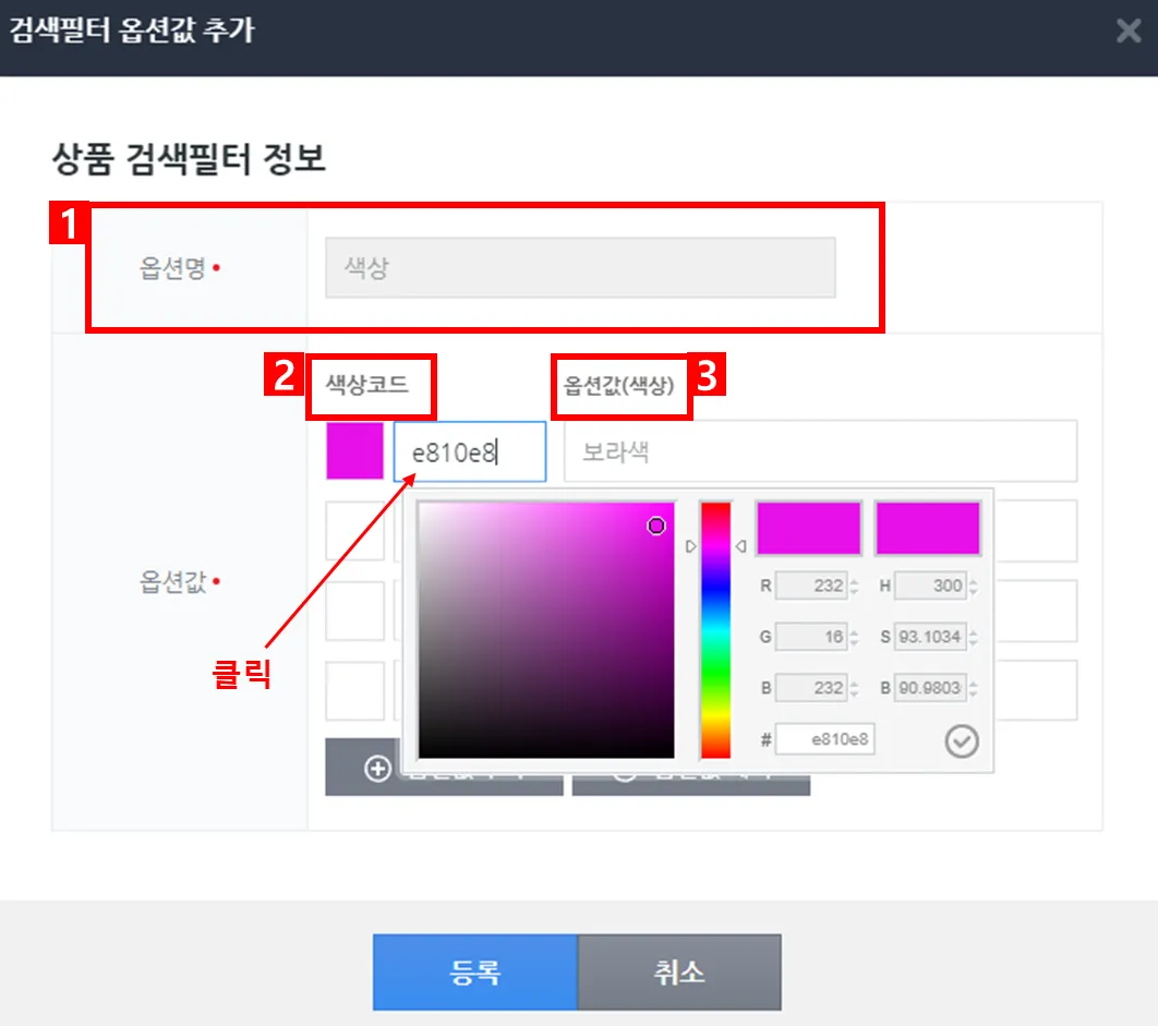 ③ 옵션값(색상)에 색상 이름을 입력 하고 '등록' 버튼을 클릭 합니다.