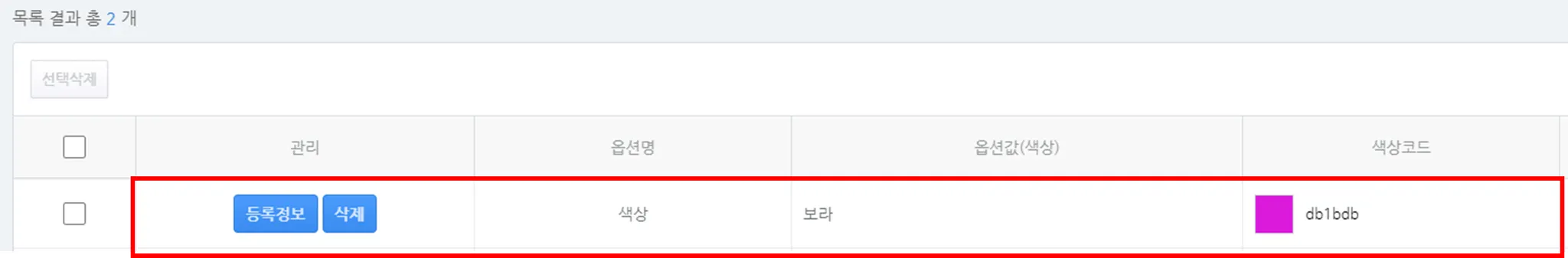 3) 등록이 완료되면 ‘목록 결과’ 화면에서 등록된 ‘색상’ 필터 값을 확인할 수 있습니다.