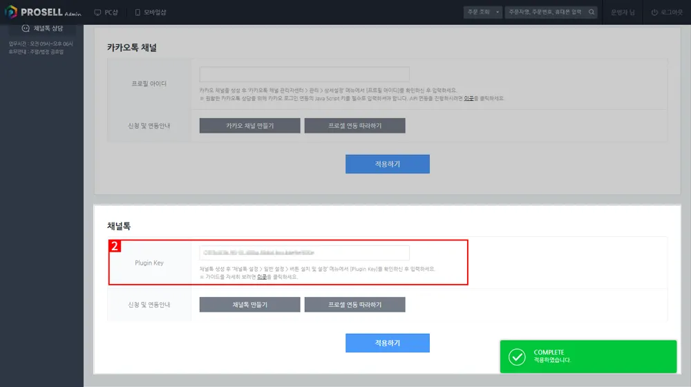 ② 프로셀 쇼핑몰 설정 > 외부연동 설정 > 채팅상담 메뉴에서 채널톡의 동일 항목에 복사한 Plugin Key를 붙여 넣은 후 적용하기를 클릭 합니다.