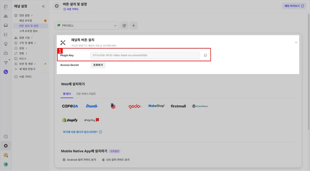 ① 채널톡의 일반 설정 > 버튼 설치 및 설정 메뉴에서 Plugin Key를 확인 후 복사 합니다.