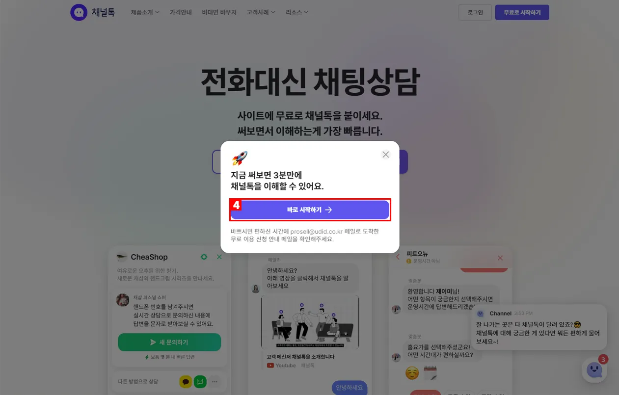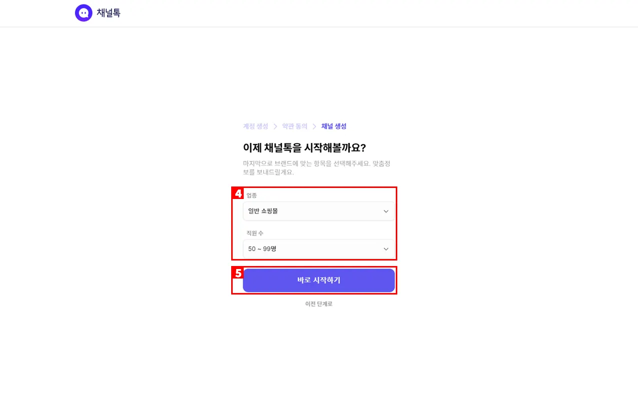 5) 바로 시작하기를 클릭하여 채널 생성을 완료 합니다.